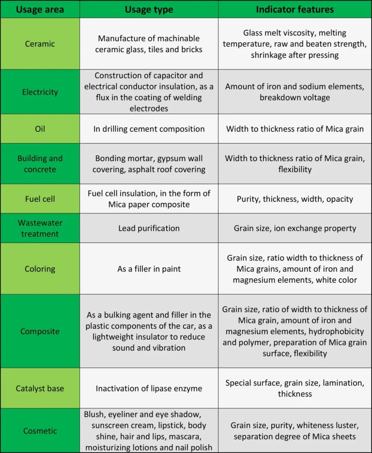 The types of Mica minerals have different uses, especially in the industry, which is presented in the following table, a summary of the Mica’s usage in different areas and the characteristic of the relevant index.